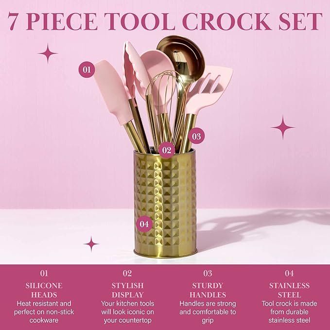 Iconic Tool Set Every Kitchen Needs: Includes a silicone spatula, solid spoon, slotted turner, tongs, stainless steel ladle, wire whisk, and a stylish tool crock. Comes in pink with a gold crock and charcoal accents.